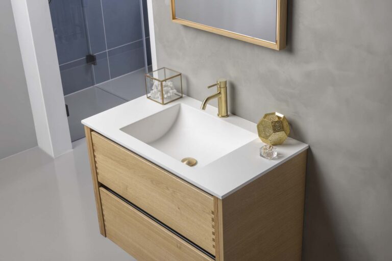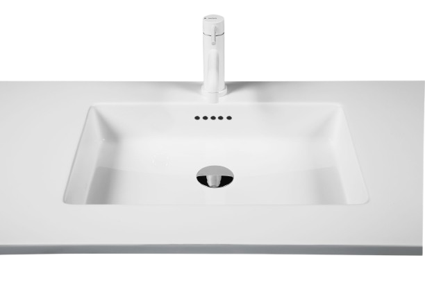 Vaskebordpladen fra marmorline, solid Surface Colombo i Arctic White, er med til at fuldende designet af møblet. Denne vaskebordplade kan vælges til eller fra.