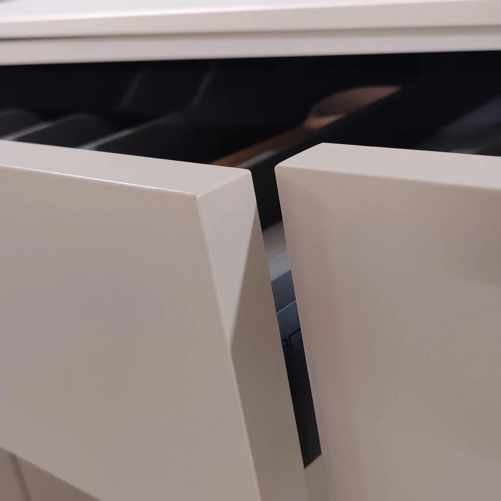 Vi bruger desuden en vandfast PUR-lim, udviklet til skibsindustrien, som sikrer, at kanter og fronter forbliver tætte – selv i rum med høj fugtighed. Vores nul-fuge-kantning gør limfugen næsten usynlig og giver et fejlfrit og eksklusivt udtryk. Alle elementer kantes hele vejen rundt, hvilket giver maksimal beskyttelse mod fugt og slitage.