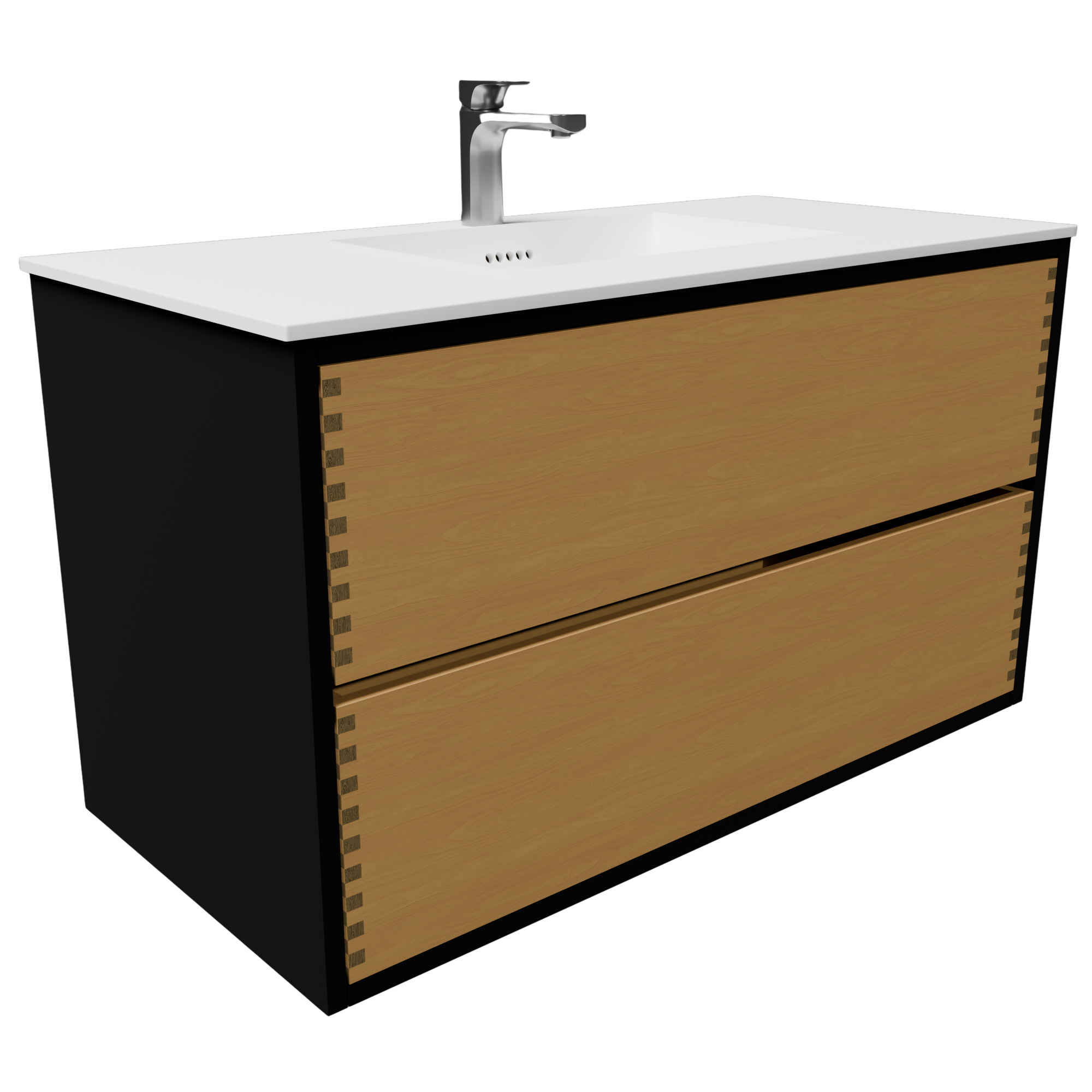 100 cm naturolieret fingertappet badmøbel med Solid Surface bordplade- Giv dit badeværelse et løft med dette rummelige 100 cm badmøbel fra Pandora Kitchen, hvor ægte håndværk møder funktionel elegance. Fremstillet i massivt naturolieret egetræ og med tydelige fingertappede samlinger er dette møbel ikke bare en praktisk opbevaringsløsning – det er et designstatement i sig selv.