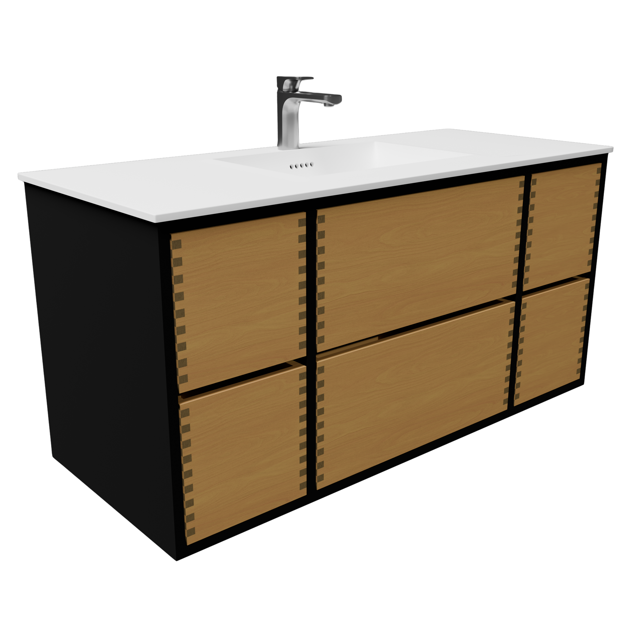 Fronten består af hele 6 rummelige skuffer, som giver optimal opbevaringsplads til alt fra håndklæder til plejeprodukter. Skufferne er konstrueret med præcise fingertappede samlinger – et klassisk snedkertegn, der både styrker konstruktionen og tilfører et elegant, håndværksmæssigt præg. Det grebsfri design sikrer et roligt og minimalistisk udtryk, mens de små, diskrete mellemrum på fronterne gør det let at åbne skufferne med et enkelt greb. Funktionalitet og æstetik går hånd i hånd, så du får et møbel, der er lige så praktisk i hverdagen, som det er smukt at se på.