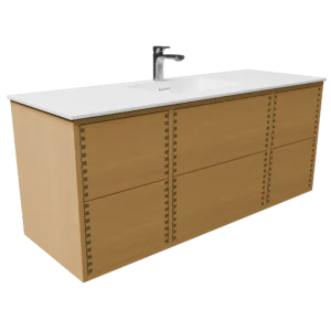140 cm badmøbel | Naturolieret m. bordplade | Push – Gør plads til både funktionalitet og æstetik med dette 140 cm badmøbel i massiv naturolieret eg fra Pandora Kitchen. Med hele 6 fingertappede skuffer i varierende bredder og en elegant Solid Surface bordplade med integreret vask, får du et møbel, der matcher behovene i det moderne familiebadeværelse – uden at gå på kompromis med design.
