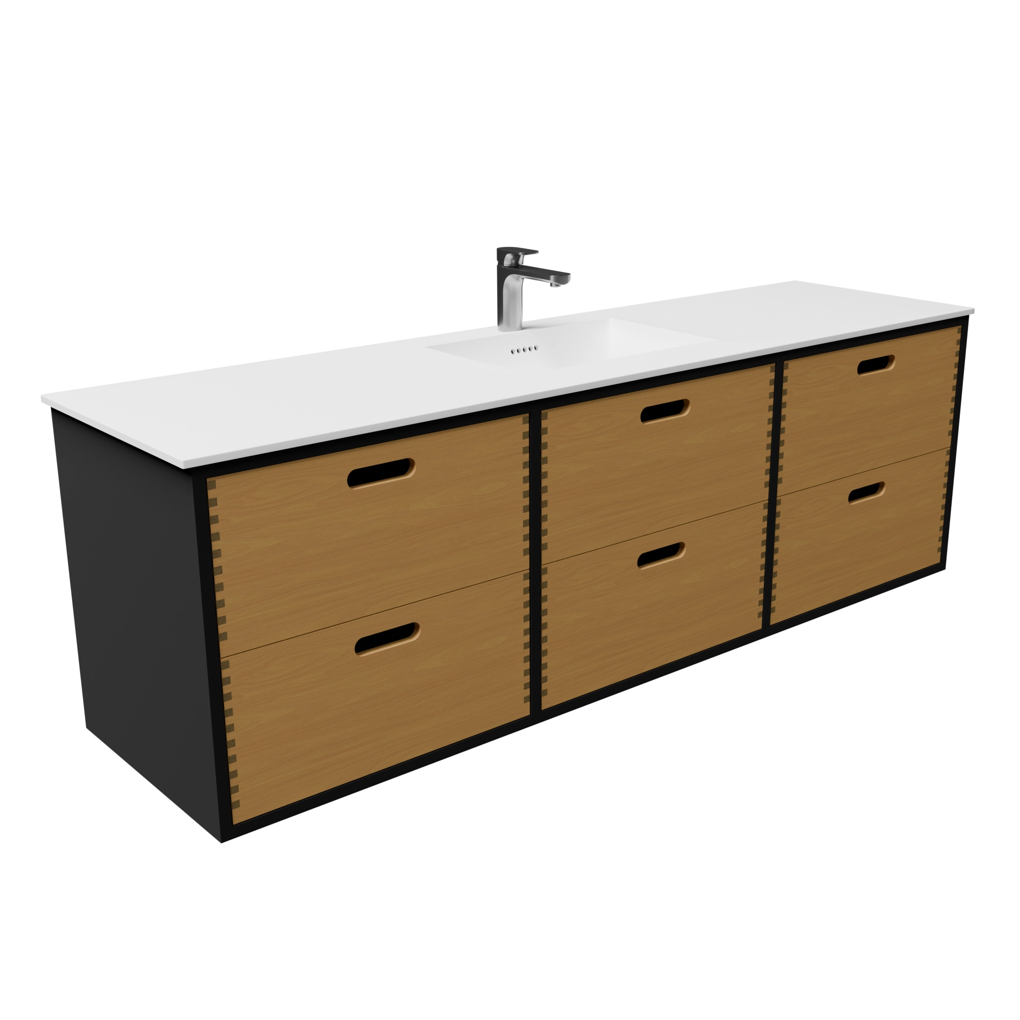 Skufferne er udført i massiv eg, behandlet med naturolie, som fremhæver træets levende årer og varme glød. Fronten er udstyret med præcise fingertappede samlinger, der vidner om ægte snedkerhåndværk og sikrer både styrke og visuel elegance. Denne kombination af moderne laminatkorpus og traditionelle fingertappede skuffer giver et unikt møbel, der skiller sig ud fra klassiske badmøbler i massivt træ.