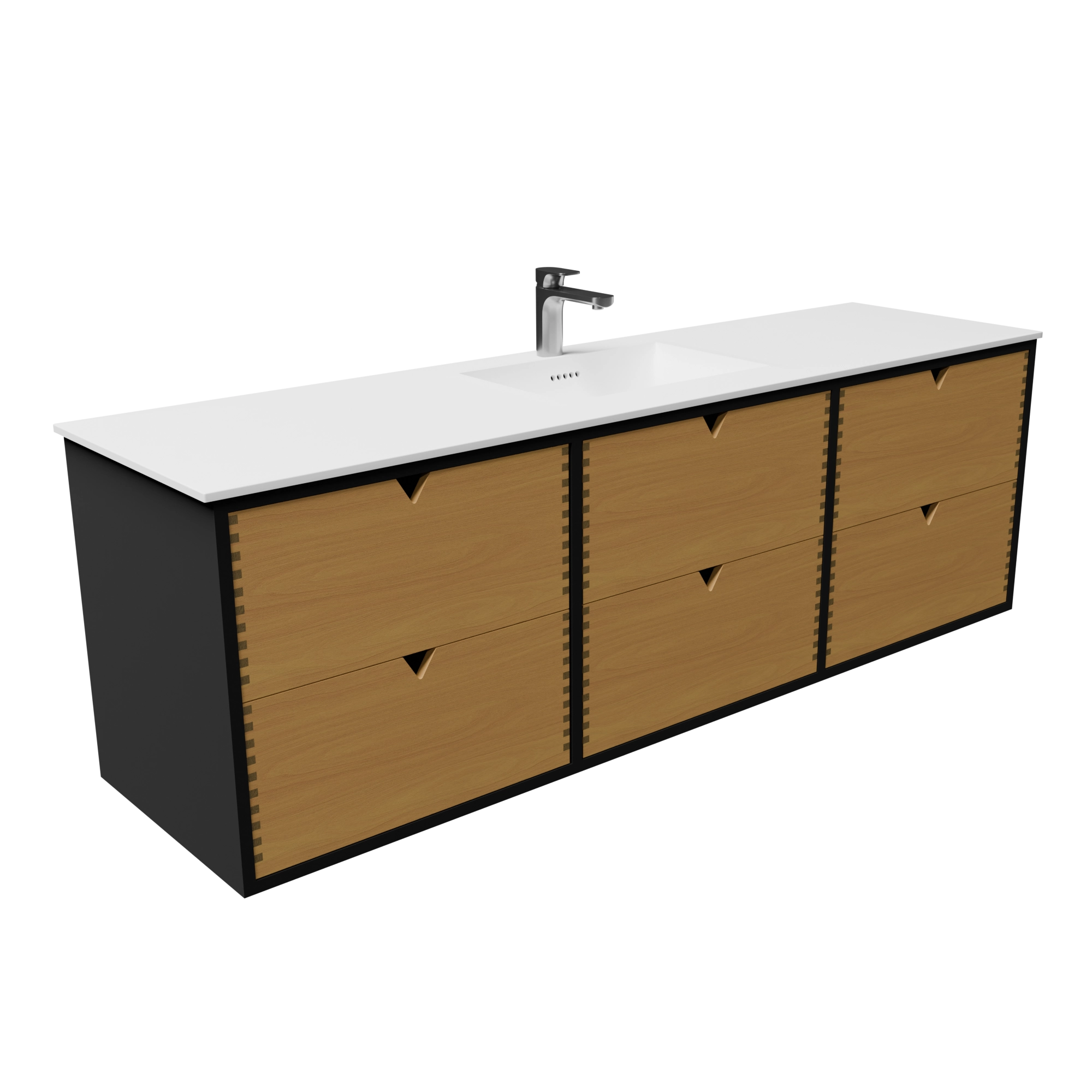Det 180 cm laminat/naturolierede fingertappede badmøbel med bordplade og greb er et møbel i særklasse, designet til dig, der ønsker maksimal rummelighed og et markant æstetisk udtryk i badeværelset. Kombinationen af sort laminat i korpuset og skuffer i massiv eg giver en stilfuld kontrast, som fremhæver både det moderne og det naturlige i ét samlet design. Med seks rummelige skuffer, en eksklusiv Solid Surface bordplade med integreret vask og de karakteristiske fingertappede fronter er dette badmøbel skabt til store badeværelser, hvor både funktionalitet og æstetik skal være i absolut top.
