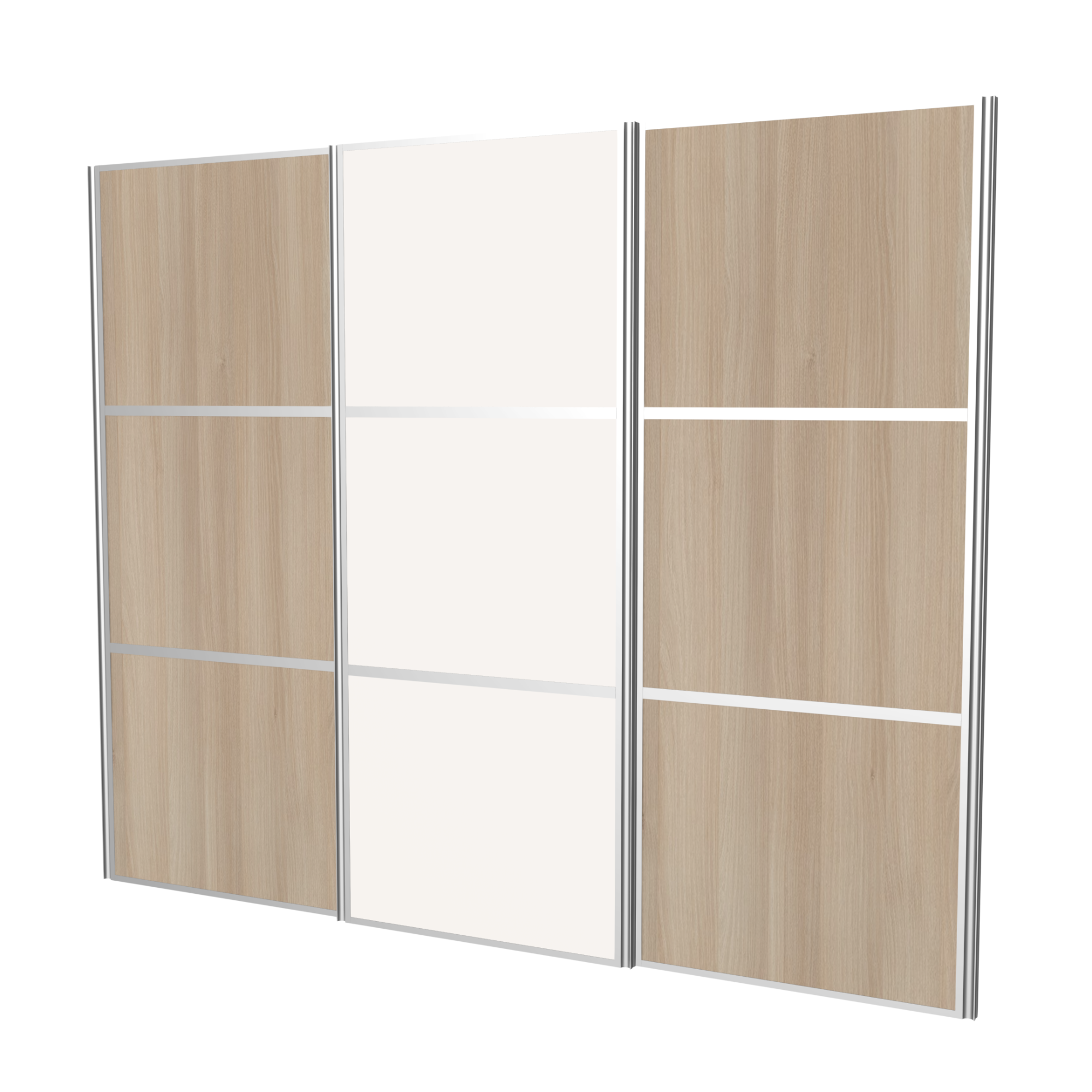 Hos Pandora Kitchen fremstiller vi alle skydelåger efter mål, så du altid får en løsning, der passer præcist til dit skab eller din niche. Med tre låger får du nem adgang til garderoben, mens det delte spejldesign giver et unikt, grafisk udtryk, der samtidig tilfører mere lys og en følelse af ekstra rummelighed til rummet.