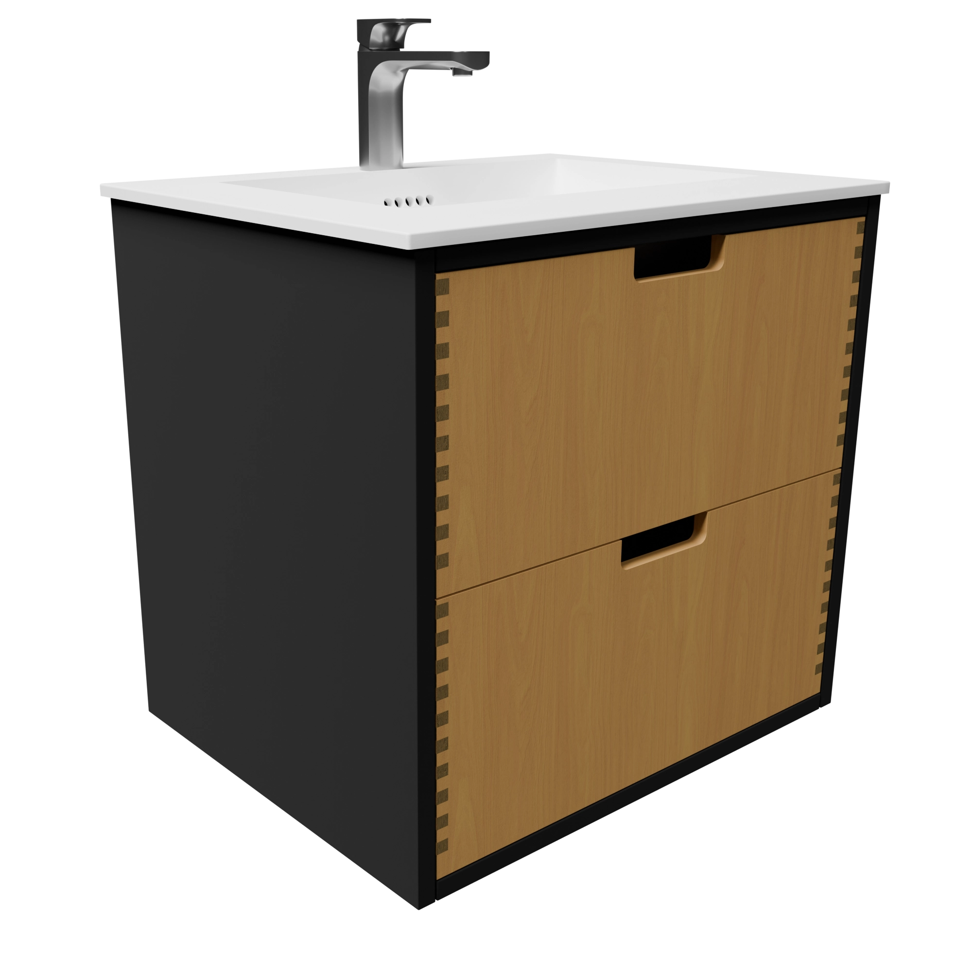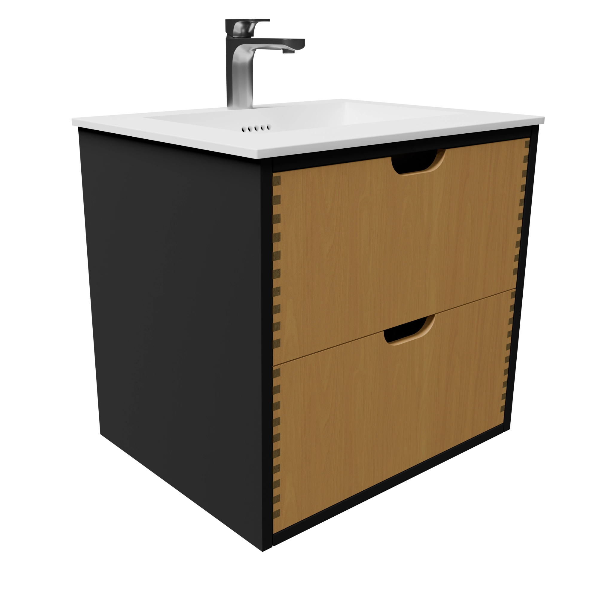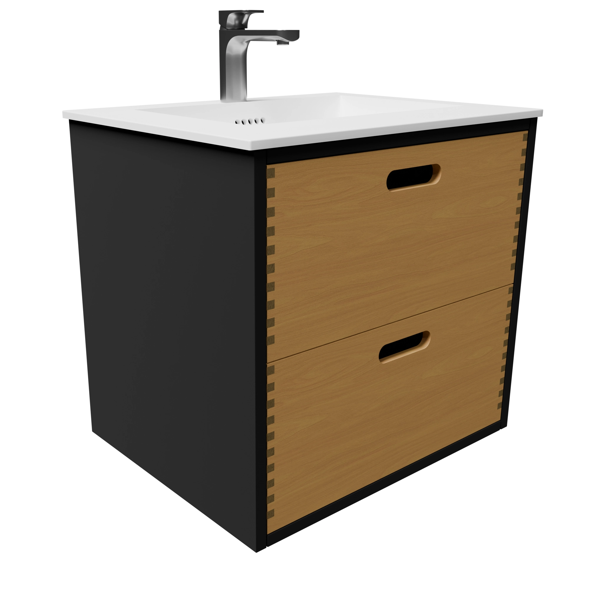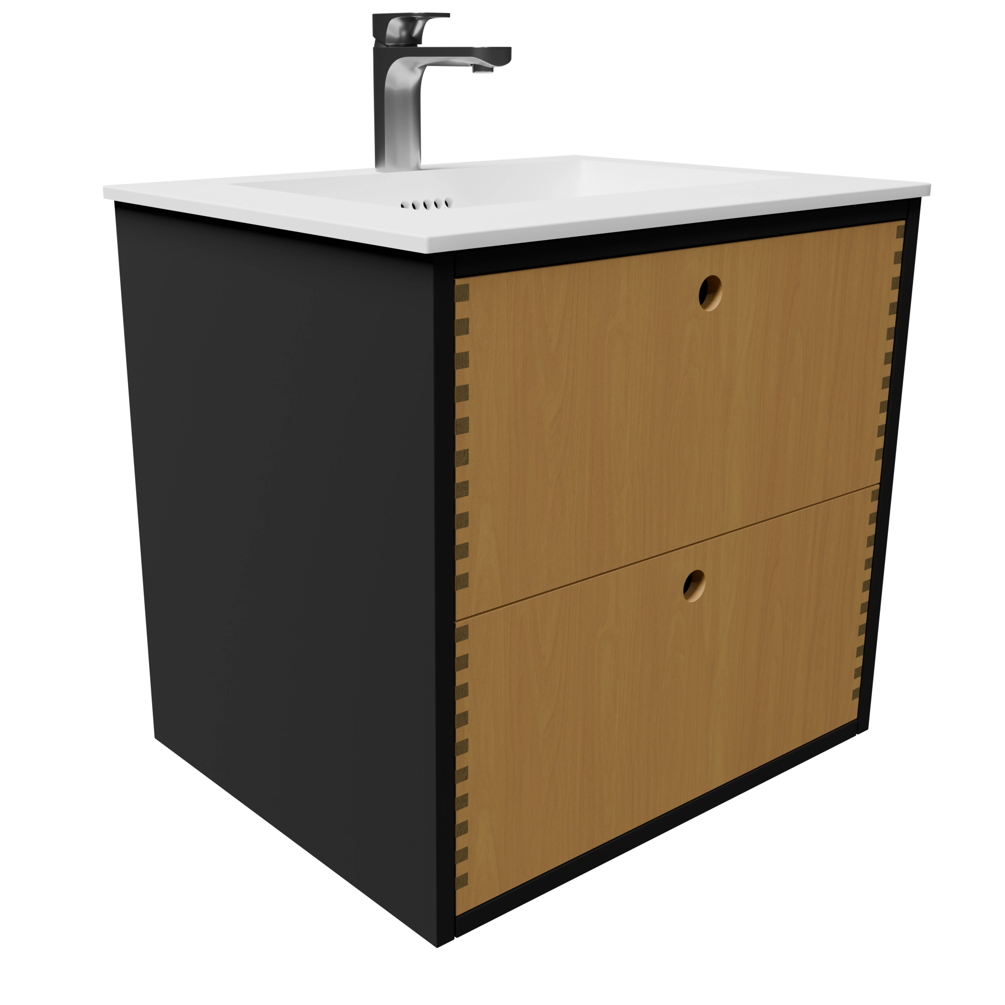 Det 60 cm laminat/naturolierede fingertappede badmøbel med bordplade og greb er en kompakt og stilfuld løsning, der forener funktionalitet, moderne materialer og klassisk snedkerhåndværk. Kombinationen af sort laminatkorpus og skuffer i massivt egetræ giver en smuk kontrast, som tilfører dit badeværelse både varme og elegance. Med en Solid Surface bordplade og integreret vask får du et møbel, der er praktisk i dagligdagen, nemt at rengøre og skabt til at holde i mange år.